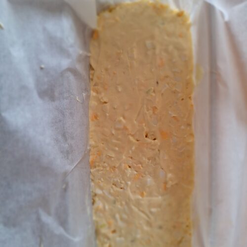 Se alege mai întâi o formă dreptunghiulară. Eu am ales un vas yena dreptunghiular (18-20 cm) sau o formă de copt pâine. Se tapetează complet forma cu o hârtie de copt, astfel încât marginile să atârne în exterior. Astfel se va scoate mai ușor salata, fără a distruge salata.