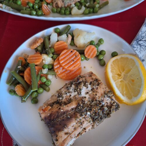 Somonul este gata, legumele, la fel, așa că putem să le servim. Somonul se servește alături de legume și cu felii de lămâie lângă. Mie îmi place zeama de lămâie pe somon, așa că folosesc din plin. Se poate pune deasupra pătrunjel tocat mărunt.