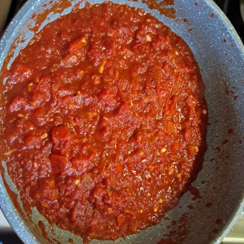 Adaugă roșiile și sarea. Lasă sosul să fiarbă încet 10-15 minute, până se leagă și devine consistent. Regula de aur pentru shakshuka este că sosul trebuie să fie suficient de fluid ca ouăle să se poată poșa, suficient de dens ca să le susțină. Dacă folosești sos de roșii/ pastă de roșii foarte concentrat (ă), poți să diluezi cu puțină apă cât să devină curgător, dar nu apos.