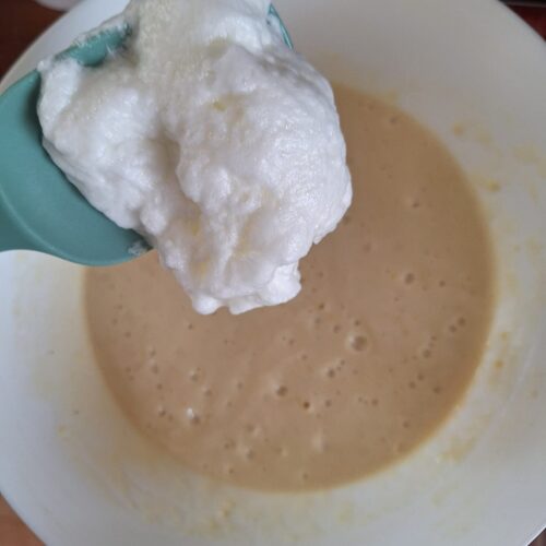 - Secretul texturii și încorporarea. Separat, albușurile cu un praf de sare se mixează spumă, apoi se încorporează ușor în compoziția cu făina, cu mișcări largi, de jos în sus.