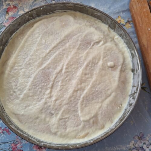 Când aluatul a crescut, se împarte în două. Într-o tavă, de preferință rotundă, unsă cu ulei și tapetată, se așează prima foaie întinsă. Se toarnă umplutura și apoi se pune cealaltă foaie, care trebuie să acopere marginile (te poți ajuta de o furculiță).