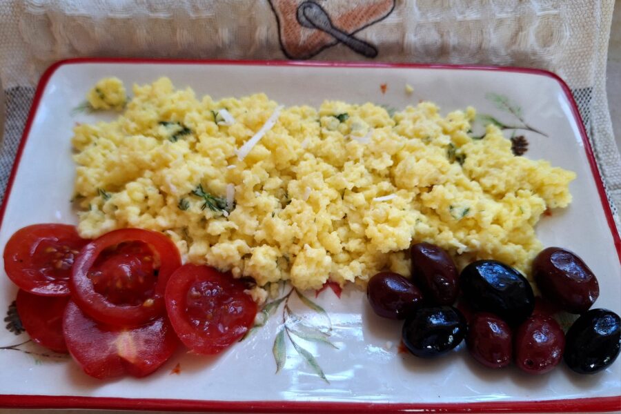 Se servește caldă, simplă, direct din tigaie sau pe o farfurie, cu pâine prăjită. Este potrivită pentru un mic dejun consistent, dar și pentru o masă rapidă, ușoară, în orice moment al zilei.