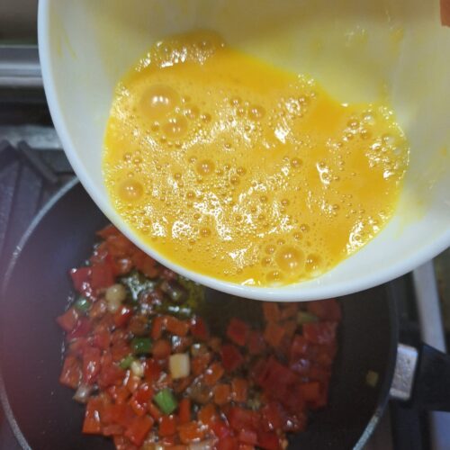 - Bate ouăle cu un praf de sare și piper. Toarnă-le peste legume, adaugă brânza și măslinele.