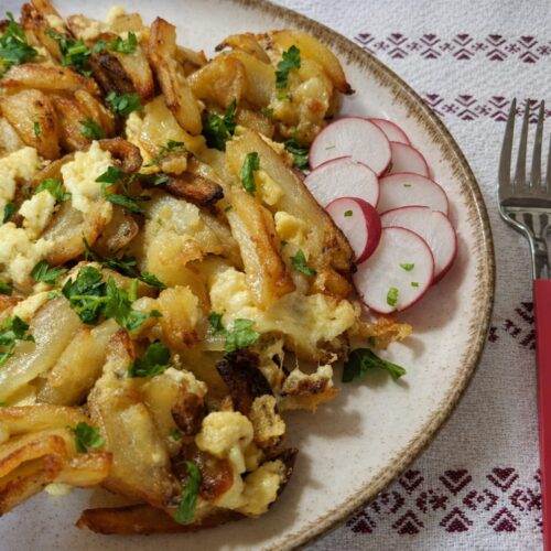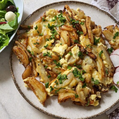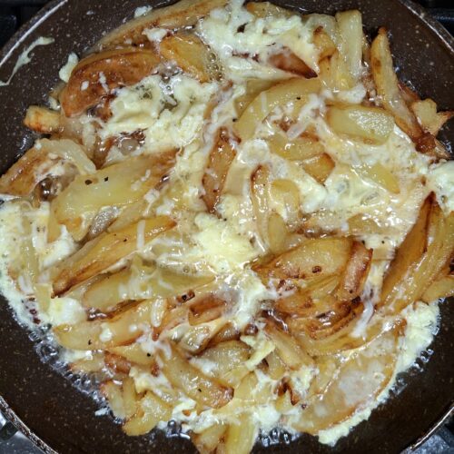 • Pentru un strat mai vizibil de brânză, mozzarella se poate presăra direct peste cartofii din tigaie, după adăugarea ouălor. Vor forma o crustă ușor rumenită la suprafață.
